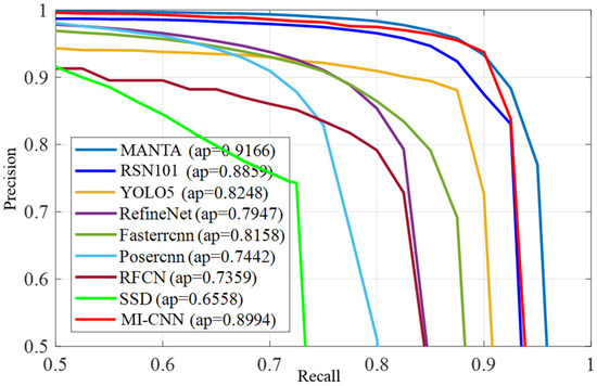 The discernible trend in Figure 8 illustrates that the MI−CNN network boasts a higher detection accuracy when compared to the majority of prevailing vehicle detection methods. Its performance is second to the MANTA method [23], which integrates an iterative Region Proposal Network (RPN) with prior database information. This observation substantiates that the streamlined basic feature extraction network and the incorporation of the supplementary edge point localization task do not impede the object detection prowess within the dataset. Conversely, they enhance the network’s capacity to generalize effectively across diverse scenarios, resulting in improved overall detection performance. The mean Average Precision (mAP) achieved by the MI−CNN network stands at 89.9%. This figure surpasses the mAP of RSN101 by approximately 1.3%, based on the original ResNet−101 network. The distinctive strength of MI−CNN emanates from its adept fusion of rich textures and comprehensive semantic information. Through the amalgamation of shared feature maps across various levels and scales, the network is adept at capturing both intricate details and holistic context. Furthermore, the accuracy of candidate vehicle boxes can be further elevated through subsequent iterations and the optimization of the region of interest (ROI) area.