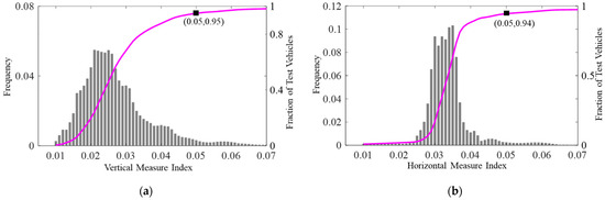 Point location results of the two measure indexes: (a) point location results of the vertical measure index; (b) point location results of the horizontal measure index. The pink line is the Fraction of test vehicles.