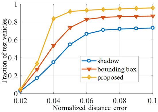 Subsequent to the optimization of structural parameters, the distance measurement of target vehicle components is undertaken even under challenging operational conditions. In order to gauge the method’s effectiveness, a comparison is made with two alternative measurement techniques within the same video dataset. These techniques entail shadow segmentation and external bounding box−based methods. To assess accuracy, a curve plotting the normalized ranging error along the horizontal axis and the cumulative proportion on the vertical axis is generated, as depicted in Figure 11. Remarkably, under equivalent measurement error thresholds, the method introduced in this paper consistently yields a notably higher count of vehicles compared to both the shadow segmentation and bounding box approaches. In scenarios where the shadow of the target vehicle is perturbed and becomes arduous to segment accurately, the corresponding shadow model exhibits greater errors. This phenomenon is depicted within Area A of Figure 12. When the lower edge of the target vehicle is obscured entirely, leaving the camera’s view limited to the roof, both the shadow segmentation model and the bounding box method confront difficulties in identifying the horizontal reference area. Consequently, these methods need to improve in their ability to maintain accurate measurement, which is evident in Area B of Figure 12.