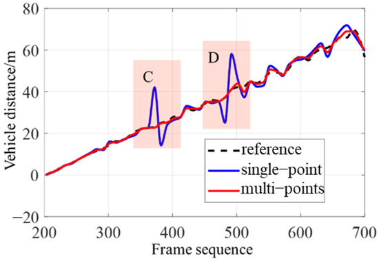 In the ultimate phase of verification, an experiment is conducted to ascertain the robustness of our algorithm in the presence of vehicle turbulence. A test vehicle is driven in a straight path across a bumpy road. The traditional model relies on a single−point approach, and our hybrid model measures the distance variation between two vehicles. The outcomes of this experiment are contrasted and compared in Figure 13. The vehicle distance variation, taken about frame 200, is plotted on the vertical axis. The horizontal axis represents the corresponding frame numbers. The single−point model necessitates the assumption of a constant camera pitch angle. Consequently, when a vehicle experiences jolts or abrupt movements, this model produces unreasonable maximum or minimum vehicle distance estimates. This discrepancy is evidenced in Areas C and D of Figure 13. Unlike the single−point model, our algorithm can dynamically select the most appropriate ranging model and reference edge points, guided by the vehicle’s yaw angle and gradient information. This adaptability renders our algorithm less susceptible to the disruptive influences of vehicle turbulence or shadow interference, ultimately contributing to its superior robustness in real−world applications.