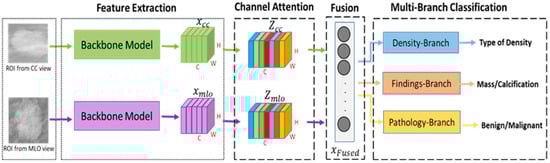Our system classifies input ROIs into three distinct groups: density, severity level, and abnormality type. To enhance feature representation and task-specific learning, we integrated three branches of fully connected layers at the end of the fusion model.