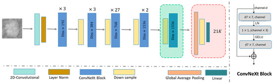 This diagram illustrates ConvNeXt-L, our backbone model, highlighting customized layers (red boundaries and shading) and key features in the penultimate layer (green box) for our mammography image classification task.