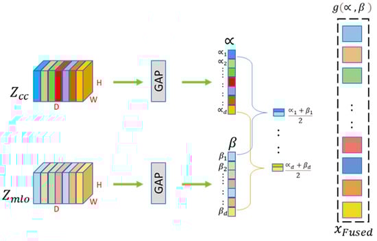 In the fusion block, GAP is calculated separately for the CC and MLO feature maps produced by attention block, followed by average CC and MLO feature correspondence to the same position.