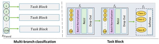 We employ the softmax activation function in each group’s output layer for these tasks. This function transforms the network’s output into class-specific probabilities, aiding in accurate class determination. The choice of softmax is guided by our multi-label classification needs and the nature of the tasks. Figure 5 illustrates the multi-branch classification block.