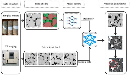 The collective Xiyu conglomerate was subjected to CT scanning. After three-dimensional reconstruction of the obtained CT images, slicing was performed. Subsequently, different components within the rock were labeled. A dataset for training and validation of the deep learning model was generated. Afterwards, instance segmentation of other regions was performed using the trained model. The porosity of the rock was calculated, and the boundaries of each component were segmented. A high-precision numerical simulation model was generated using the segmented images. Two-dimensional biaxial compression tests were conducted. This section will provide a detailed discussion of these steps.