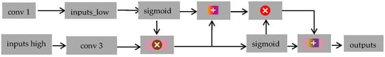 Firstly, two hierarchical features are inputted, as shown in Figure 5. The symbols ①, ②, ③, and ④ represent the feature maps of different scales, which are illustrated in Figure 5. When ① is used as the high input, ② becomes the low input. Both features pass through the conv module to adjust their channel numbers. The low feature undergoes a sigmoid activation and is then multiplied elementwise with the high feature, aiming to enhance edge information. The resulting feature is then combined with the low feature to obtain richer semantic information. The high feature is also passed through a sigmoid activation and multiplied elementwise with the previous feature to enhance attention towards the region of interest. Finally, the resulting feature is added to the high feature to obtain the output. This achieves bidirectional fusion. The output is used as the high feature, while ③ is used as the low feature, repeating the aforementioned process. Ultimately, the features are combined at each level, fully utilizing features of different scales. Essentially, we integrate features at various levels. Initially, ① and ② are fused, and the outcome is subsequently combined with ③. The resulting output is then further integrated with ④, completing the entire feature-splicing process.