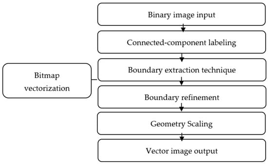 The transformation from a binary image to a vector image can be achieved using the following method. Figure 6 illustrates four steps, including connected-component labeling, the boundary extraction technique, boundary refinement, and geometry scaling.