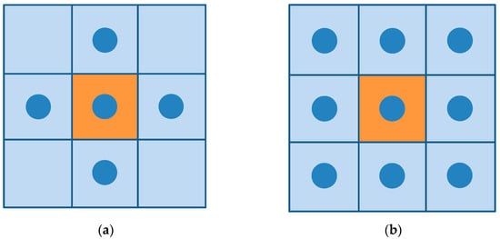 To obtain the microstructure’s geometry, such as pores or gravel, each pixel’s group is determined. A fast two-pass method algorithm segments the geometry into regions. A zero matrix of size f, a label variable l, and a label set variable li are initialized. The neighborhood Ω is shown in Figure 7, and a 4-neighbor domain is utilized. The first pass labels each pixel and its domain. A loop constructs domains with the same label.