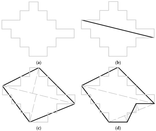Illustration of geometry boundary refinement algorithm: (a) initial boundary polyline, (b) first polyline segment, (c) second polyline segment, (d) final boundary polyline [36].