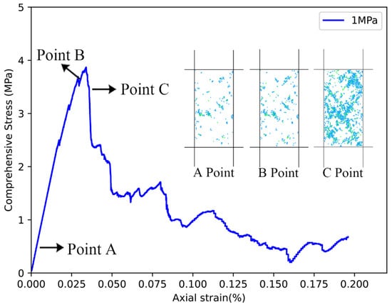 During the pre-peak phase (point A), the stress–strain curve forms an approximately straight line, signifying the model’s presence in the elastic phase. The formation of cracks is relatively limited, and those that do appear tend to align with the direction of maximum compression. These cracks are distributed across the specimen and appear to be non-interacting. A non-linear curve (point B) emerges as the strain increases before reaching the peak, signifying the model’s partial entry into the plastic phase with rapidly developing cracks. One or more macroscopic failure planes develop, cutting across the specimen. As the stress–strain curve transitions into the post-peak phase (point C), cracks continue evolving and join to form through cracks, leading to a rapid drop in the compressive stress and damage to the model. Figure 11 presents the resultant stress–strain curve, along with the entire crack development process across different stages.