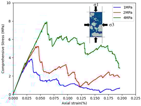 Stress–strain curves obtained through biaxial compression tests at confinements of 1, 2 and 4 MPa for a 50 mm × 100 mm specimen of the PFC Xiyu conglomerate model.