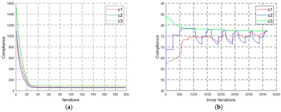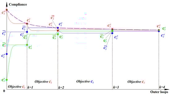 After solving the sub-TO Problem (13), a set of new cost function values is defined at a new design variable vector . The processes of cost function comparison, assigning objective and constraint functions, calculating boundary values for the constraints, and sub-TO problem solving are repeated until convergence. An example of the compliances’ evolution during Stage 2 of the optimization process is shown in Figure 2 (with three loading conditions), where the bar symbols , , and represent the critical values (boundary values) of compliances associated with the compliance functions , , and , respectively.