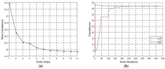where is the maximum compliance at step , is the maximum compliance at step ; and is a small positive scalar. As shown in Figure 2, the reduction in the objective function is represented by the reduction in the purple dotted line, which is the line crossing maximum compliance at every outer loop.