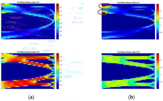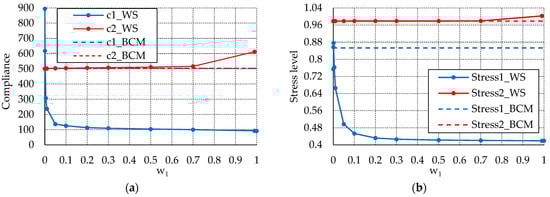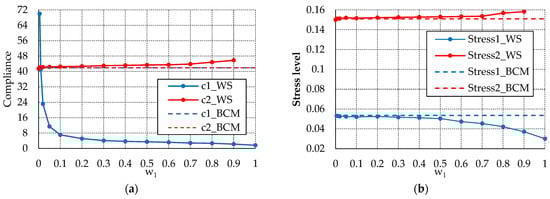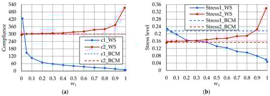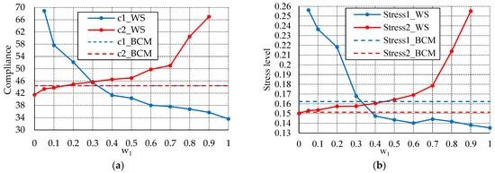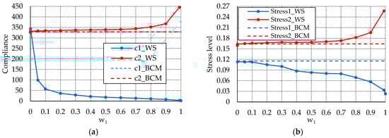 In Problem 4, the stress level under more severe loading conditions was always reduced after Stage 2 of the proposed framework, along with a reduction in the maximum compliance. For example (see Table 9), when and .0, the stress level under LC2 reduced from 0.06162 (TEWS) to 0.05960 (BCM); when and , the stress level under LC2 reduced from 0.05567 (TEWS) to 0.05380 (BCM); and when and , the stress level under LC1 reduced from 0.06717 (TEWS) to 0.06630 (BCM). This illustrates that controlling the compliance can help control the stress level under the same loading conditions.