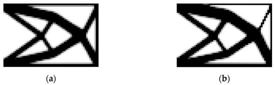 where is the length of the entire design domain; and is the range in which the distributed load is applied to the lower edge of the design domain. Usually, when considering a compliance minimizing problem, a volume constraint is used, which is set to of the domain (). The material is assumed to have Young’s modulus and Poisson’s ratio .