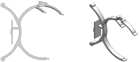 A model for a compliant mechanism to be used in the structure of a marker support system was developed and tested by various methods [1], with a final result being obtained in the form of the shape in Figure 1. The model took into account a force of 35 N maximum to be applied to each side of the marker support system, with PLA being used as a material to build the part by using Fusion Deposition Methods—thus obtaining a total stroke of approximately 30 mm, allowing for eyewear with a total height of up to 60 mm to be measured.