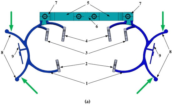 Shapes and materials previously studied [1] were used to create and assemble the system as presented in Figure 2a,b. The first of the two shows a frontal view of the marker support system, as viewed by the optometrist. It comprises two compliant mechanisms: (1), one for each of the two openings of the glasses frames on which the system will sit by means of supports (2), (3) and (4). A large number of supports is needed to accommodate a large number of the shapes and sizes of glasses frames. As such, the mounting of the device onto a pair of glasses is performed by applying a force of up to 30 N to each side of the frame using handles (8), resulting in a larger opening between supports (2) and (4), as well as (2) and (3). Next, supports (3) and (4) are placed on the upper side of the frame, (2) is placed on the lower side and the force is removed. The bridge between the two lateral compliant mechanisms is flexible, allowing the support to match the glasses frame’s curvature. The bridge comprises a central fixed section (6), a flexible portion (5) and a fixed marker support section (7). Lateral marker support is offered by means of support (9).
