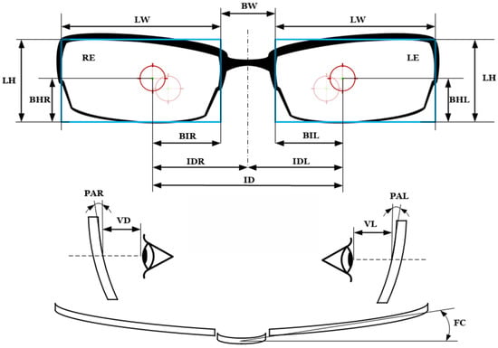 Among the measurements that can be taken are the following: IDR (interpupillary distance, total as well as right IDR and left IDL), LW (lens width, both left and right), LH (lens height, left and right), BW (Bridge Width), BHR and BHL (pupil distance to lower part of lens) as well as BIL and BIR (pupil distance to lower part of lens). Along these, measurements related to vertex distance (VL and VD), distance between the pupil and lens, PAR and PAL (left and right pantoscopic angle) as well as the glasses frame curvature FC are included.