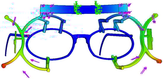 To this end, several materials were considered, of course, principally taking into consideration the notion that they should be inherently chemically inert to external use with the person wearing the glasses and the support system. Using this as a starting point and after some tests and consideration, as presented in a previous study [1], a specific version of thermoplastic polyurethane was chosen [1], with some of the material’s properties being density 1.18 g/cm3, a Young modulus of 0.396 GPa and a yield strength of 65.85 MPa. While these parameters are specific to this material and do allow for the imposed travel of the mechanism’s supports at approximately 30 mm at a 35 N-applied force on each end, further research has proven that such mechanical behaviour can also be obtained by using other materials, such as specific variants of Polylactic acid PLA. Also, some studies could be performed in order to determine to what extent, for this specific shape and purpose, slicing and FDM [37,38,39,40,41,42] parameters influence compliant behaviour, as well as long term use of the system.
