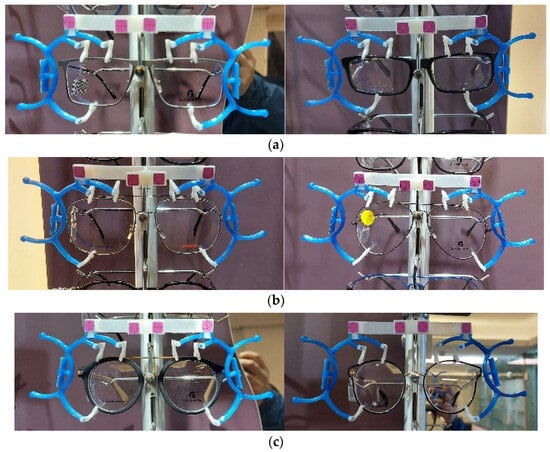 In order to confirm that the designed frame would indeed hold its shape when worn by a user and allow for the system to capture certain parameters, tests were performed that involved the device being fixed to a user’s glasses, and information was obtained via visual, then computerized, confirmation that the user’s parameters were indeed similar to those measured by other means. Such an example is shown in Figure 8a–c, discussed in detail as follows.