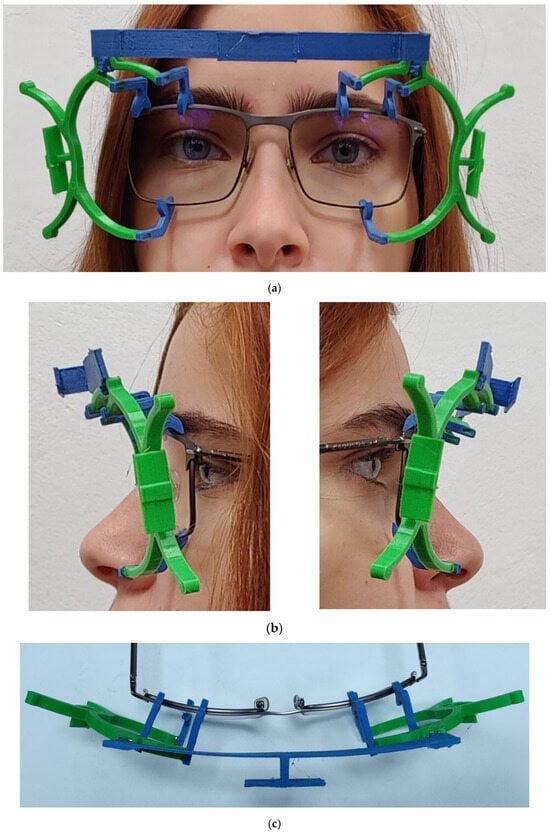 Figure 8b allows for a view of the patient wearing the supports along with the glasses frames. This view also allows for confirmation that the markers will, at least visually (to be later confirmed by image processing), allow for an approximation of the user’s pantoscopic angle. While it is usual to take only one pantoscopic angle into consideration, the system was designed to allow for different measurements to be taken both for the user’s left-side and right-side pantoscopic angle. This view also confirms that, due to the offset of the support system relative to the glasses frames, there is no interaction between the user and the compliant mechanism.