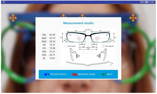 Using the images captured of the patient wearing the glasses mounted with the marker support system, several tests were conducted to confirm the validity of the assumptions made by the authors during the design process. As such, using a pre-alpha test application, also developed during the work done in this paper (preliminary results have indeed been found to confirm that the measurements taken are close to reality), was conducted by comparing image processing results with those obtained using the usual measurements. Figure 9 depicts the results obtained by analysing an image similar to that in Figure 8a, with markers added in their respective positions.