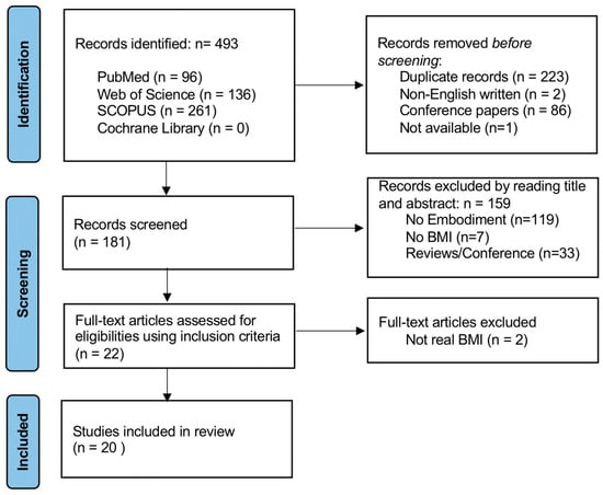 The searching strategy returned 493 articles, 223 of which were duplicates. A total of 2 were in foreign languages, 86 were conference papers, and 1 was not full-text available. From the remaining 181 articles searched, 119 did not have any type of sense of embodiment measures, 33 were reviews or conference papers, and 7 did not use brain–machine interface devices. After full-text reading, 2 papers were excluded for using just a simulation of a BMI. This resulted in a final list of 20 papers in our review. Details of the process are described in the flowchart (Figure 1).
