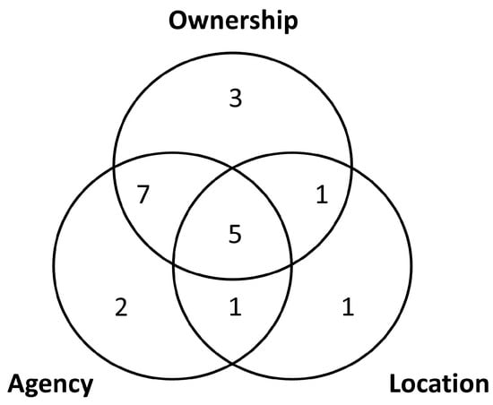Differences in the nomenclature of the various SoE components were present in the studies analyzed. As we have followed the classification proposed by Kilteni et al. (2012), it was necessary to specifically analyze all the questions posed in each of the studies to be able to fit them into the scope of SoO, SoL, or SoA (see Table 1). It was found that there is great heterogeneity in the terminology used. For example, in some studies, the authors used the term SoE when referring to “It was as if the virtual body was my body” and the term sense of control when referring to “I felt in control of avatar’s actions” [,]. However, according to Kilteni et al., 2012, this should be included in the SoO and SoA categories, respectively. Among the 20 studies included in this review, 16 had SoO questions, 14 had SoA questions, and 8 studies had SoL questions in their questionnaires. Only five studies had questions covering the three components of the SoE. Other combinations of SoE components can be analyzed in Figure 2.