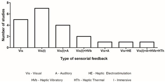 A total of eight studies included two sensorial modalities (8/20 = 40.00%) [,,,,,,,]. From these, 5/20 = 25.00% included visual (or visual immersive) and auditory feedback [,,,,] and 3/20 = 15.00% included haptic feedback [,,]. In two studies where visual feedback was paired with auditory feedback, an improvement in BMI performance and in SoE (or one of its components) occurred [,]. In the remaining three studies, either no difference in BMI [,] or in SoE [] was reported. Meanwhile, in the three studies where haptic feedback was paired with visual feedback, no improvement in SoE nor in BMI performance was reported in one case [], and no values were reported in another []. The third study with two haptic modalities [] tested somatosensory and visual feedback and revealed that the congruent somatosensory feedback prevailed over incongruent visual feedback, namely increasing SoE and BMI performance. This study was performed in a single patient using intracortical recordings. Only one study included four different types of sensory feedback (visual, auditory, haptic vibratory, and haptic thermal) [], but no difference in embodiment or in BMI performance was reported. It is noteworthy that this study was performed on a patient and included only 10 sessions.