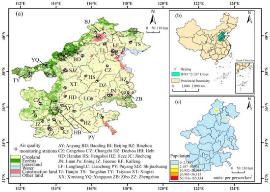 Study area. (a) The land-use-cover data and spatial location of air quality monitoring stations in the “2 + 26” cities of BTH; (b) the spatial location of the “2 + 26” cities of BTH in China; (c) the population data for the “2 + 26” cities of BTH.