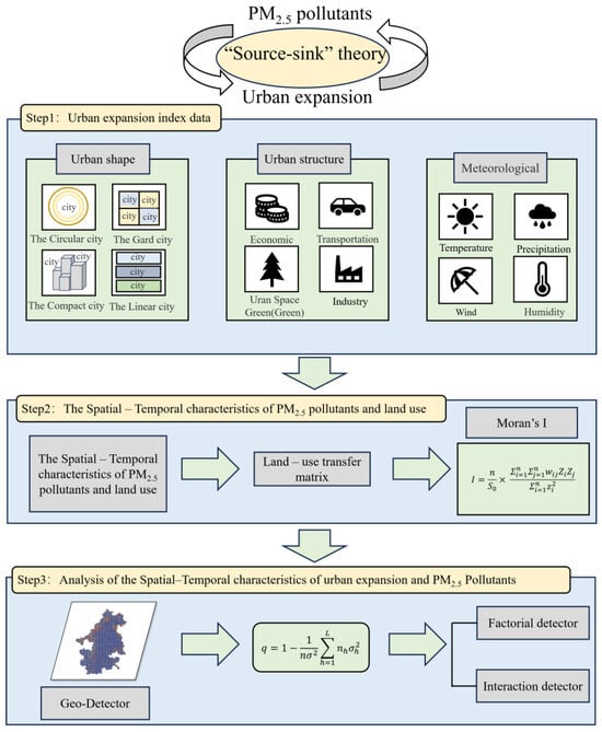 This study analyzed the degree of urban expansion and the PM2.5 pollution problem in the “2 + 26” cities of BTH. We took the PM2.5 pollutants as the dependent variable and the urban spatial morphology index and socio-economic and meteorological data as the independent variables to construct a dataset. We calculated the urban construction land and analyzed the spatial-temporal aggregation characteristics; specifically, we combined our method to analyze the influence of PM2.5 pollutants by the factorial detector and recognized the effects of interactions through interaction detection in the Geo-Detector (Figure 2).