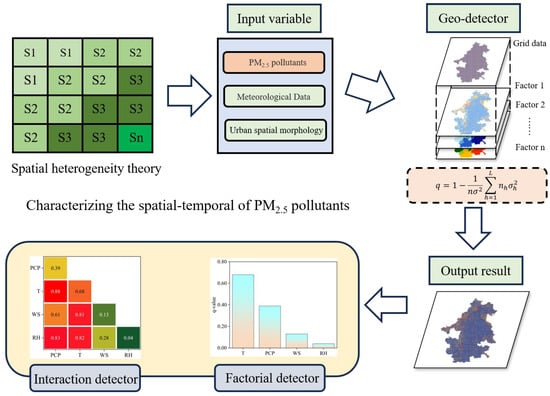 Based on the core concept of geospatial heterogeneity [], we used Geo-Detector to construct spatial matrices of urban spatial morphology and PM2.5 pollutants. Then, we used Geo-Detector to calculate their spatial correlations, which could better reflect the causes and mechanisms behind geographic phenomena than traditional models []. Spatial heterogeneity included a significant change in the relationship between certain variables in space with spatial changes; secondly, the statistics (e.g., mean and variance) of certain variables in space changed smoothly or not smoothly with the spatial changes []. Our study focused more on the spatial variation of geospatial elements.