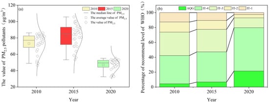 The concentration of PM2.5 pollutants in the “2 + 26” cities of BTH increased by 12.86% from 2010 to 2015. After the development of the city in 2020, Figure 5a shows that PM2.5 pollutant concentrations significantly shifted, from 82.62 μg/m3 to 47.05 μg/m3. However, the average concentration of PM2.5 pollutants in the last ten years was 67.63 μg/m3. Considering the WHO-recommended level [], the PM2.5 pollutants in the “2 + 26” cities of BTH were classified into AQG (Air Quality Guidelines) and IT (Interim Targets). We classified the PM2.5 pollutants’ annual mean concentration values into five classes: AQG (0.00–15.00 μg/m3), IT-4 (25.00–37.50 μg/m3), IT-3 (37.50–50.00 μg/m3), IT-2 (50.00–75.00 μg/m3), and IT-1 (>75 μg/m3) (Figure 5b). In 2020, the AQG and IT-4 percentages increased by 17.13% and 20.09%, respectively, compared with the 2010 recommended PM2.5 pollutant levels.