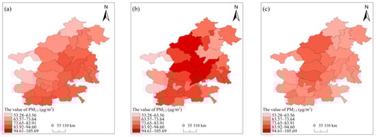 The spatial characteristics of PM2.5 pollutants in the “2 + 26” cities of BTH. (a) the PM2.5 pollutants in the “2 + 26” cities of BTH in 2010; (b) the PM2.5 pollutants in the “2 + 26” cities of BTH in 2015; (c) thePM2.5 pollutants in the “2 + 26” cities of BTH in 2020.