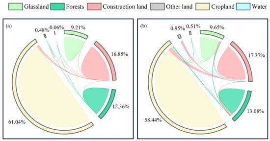 The land-use transfer matrix in the “2 + 26” cities of BTH. (a) the change of the land-use transfer matrix from 2010 to 2015; (b) the change of the land-use transfer matrix from 2015 to 2020.