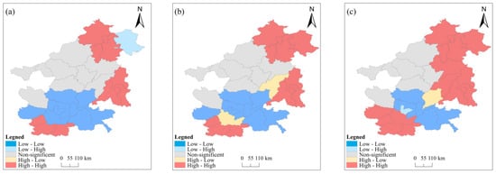 The spatial characteristics of the LISA index for construction land in the “2 + 26” cities of BTH. (a) the LISA index of construction land in 2010; (b) the LISA index of construction land in 2015; (c) The LISA index of construction land in 2020.