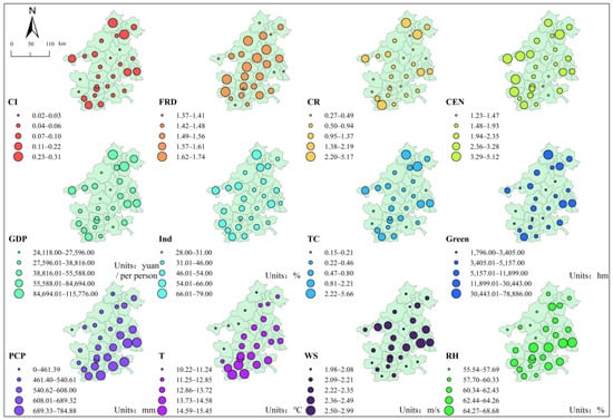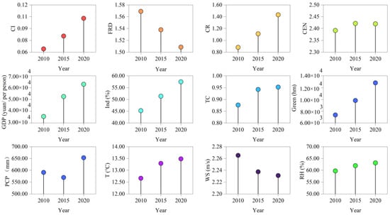 There is a clear time-divergence feature of the influence factor expansion from 2010 to 2020 (Figure 9) as the “2 + 26” cities of BTH continued to transform into green, sustainable, and high-quality cities. Except for FRD, which showed a decreasing trend, the spatial structure influence factors of the cities were enhanced annually. With the acceleration of the urbanization process in the “2 + 26” cities of BTH, the CI, CR, and CEN increased by 0.04, 0.55, and 0.03, respectively. The increasing intensity of human activities in the process of rapid urbanization led to a continuous upward trend in the spatial structure from 2010 to 2020. Compared with the factors affecting urban spatial patterns, meteorological factors were less affected by urban expansion and human activities. There were obvious nonlinear differences in the interannual trends in PCP among various meteorological factors.