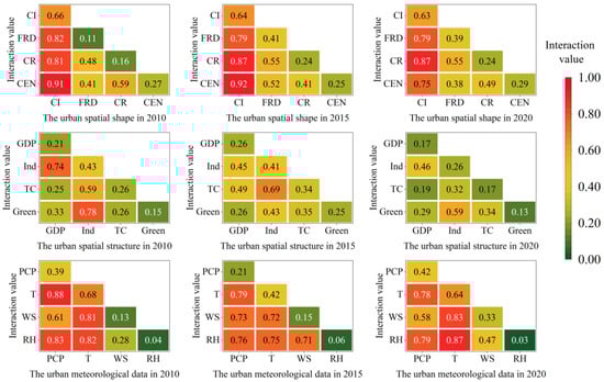 The interaction values of the geo-detectors explain the spatial heterogeneity characteristics of PM2.5 pollutants in the “2 + 26” cities of BTH. When the interaction value between factors is higher, it indicates a greater influence on the spatial variation characteristics of PM2.5 pollutants, and vice versa, it has less influence on PM2.5 pollutants, and the results are shown in Figure 12. The interaction effects of the factors appeared to change dynamically with time. In terms of urban expansion factors, CI ∩ CEN (0.92), Ind ∩ Green (0.78), and PCP ∩ T (0.88) were the strongest urban spatial shape, structure, and meteorological factors affecting the spatial-temporal characteristics of PM2.5 pollutants. Additionally, in terms of the types of urban expansion factors, the strongest interaction among the urban spatial shapes between the CI and CEN remained unchanged, while Ind ∩ TC and T ∩ WS were added for urban spatial structure and urban meteorological factors, respectively.