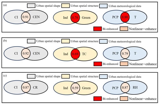 Judging from the most important urban expansion influencing factors on PM2.5 pollution in the “2 + 26” cities of BTH, all showed an increasing trend (Figure 13). Among them, the proportion of nonlinear enhancement trend in the overall enhancement trend in PM2.5 pollutants was 66.67%. In terms of spatial differentiation characteristics, the explanation rates of urban spatial shape, urban spatial structure, and urban meteorological factors all exceeded 0.50. Specifically, the most important combinations of urban sprawl influencing factors affecting the 2 + 26 cities were CI ∩ CEN (0.91), Ind ∩ Green (0.78), and PCP ∩ T (0.88). In terms of the temporal divergence characteristics, the explanation rate of each type of interaction combination showed a significant decline. Among them, the urban spatial structure declined most significantly, with the decline in the interaction combination of the Ind∩Green exceeding 0.19.