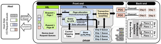 In the subsequent steps, a block ID is assigned to the target plane, and pages are programmed in a predetermined order within the block. Subsequently, the PPN of the block is calculated. After the completion of address translation, the page-sized transactions are delivered to the transaction scheduling unit (TSU) for scheduling their execution on the target die [10]. The front-end manages the back-end resources and issues I/O requests to the back-end channels via the I/O scheduler. The SSD back-end contains multiple channels. Each channel is connected to one or more chips. Each chip is made up of one or more chips, each of which has one or more planes. For processing I/O requests, such an organization offers four layers of parallelism (channel, chip, die, and plane).