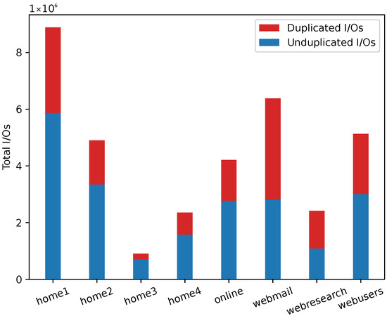 We utilized a set of block I/O trace data obtained from an operational system running for several days. These traces were collected from four different end-user/developer home directories, a course management system, and three network servers, making them widely applicable in related research [32,33]. Table 3 presents the three-week I/O data for these workloads and the characteristics of these traces.