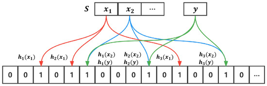 - Bloom, B.H. Space/time trade-offs in hash coding with allowable errors. Commun. ACM 1970, 13, 422–426. [Google Scholar] [CrossRef]