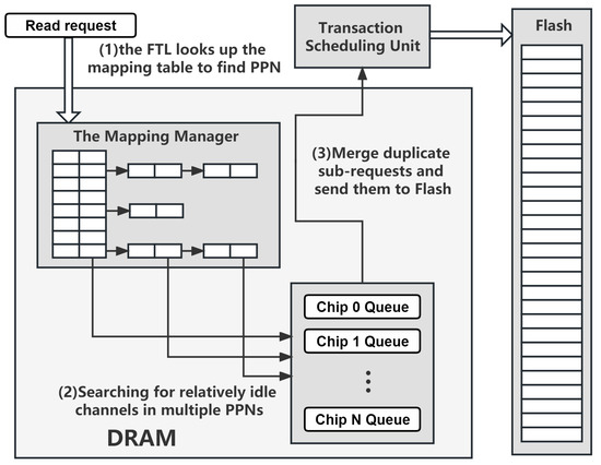 Figure 8 illustrates the detailed process of reading data in DS-FTL. Similar to existing FTL works, DS-FTL handles read sub-requests in the following manner. When a read sub-request is received by the flash back-end, DS-FTL performs a lookup in the mapping table and the indirect mapping table to retrieve the associated PPNs. One or several PPNs may be obtained. DS-FTL then transfers this result to the I/O scheduler and selects an idle path to retrieve data from one of the resident pages. If a single PPN is obtained, this indicates that the data to be read are unique within the SSD. In this case, the read sub-request is directly inserted into the corresponding I/O request queue. However, if a set of PPNs is obtained, corresponding to multiple chip queues (e.g., chip A queue, chip B queue, and chip C queue), DS-FTL chooses the chip C queue with the lowest number of requests and more available idle slots, as depicted in Figure 9. This approach ensures maximum utilization of the SSD’s parallelism and improves the efficiency of processing read requests. Furthermore, if there is a sub-request in the selected chip queue that reads similar data, DS-FTL can merge the two sub-requests to reduce duplicate read operations and unnecessary time overhead.