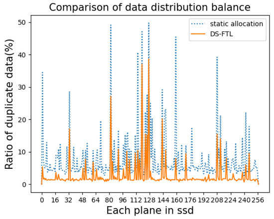 To further investigate the impact of DS-FTL on reducing data duplication, we compare the duplication rates between static allocation and DS-FTL in different planes for the home2 workload, as demonstrated in Figure 12. DS-FTL significantly reduces the duplication rate in planes with a high density of duplicate data, enhancing uniformity in the overall data distribution.