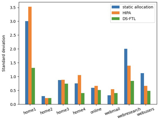 Figure 14 illustrates the standard deviation of channel utilization for the eight workloads under different allocation schemes. A higher standard deviation value indicates a greater disparity in channel utilization and a more uneven distribution of read and write requests. As depicted in Figure 14, the standard deviation for static allocation ranges from 0.30 to 3.00, with an average of 1.12. Similarly, the standard deviation for HIPA ranges from 0.23 to 3.52, with an average of 1.11, demonstrating little difference from static allocation. In contrast, DS-FTL effectively reduces the unevenness of channel utilization by allocating duplicate data to different planes. The standard deviation of DS-FTL ranges from 0.22 to 1.31, with an average of 0.61, representing a significant improvement compared to the previous allocation schemes. This reduction in standard deviation demonstrates the improved balance in channel utilization achieved by DS-FTL.