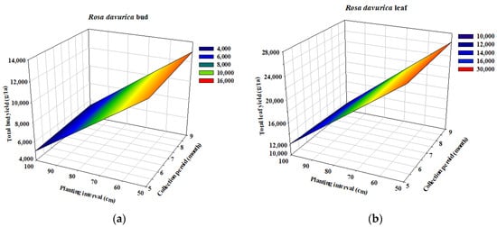 Three-dimensional mesh plot representing the effects of planting interval and collecting time on R. davurica yield. (a) R. davurica bud; (b) R. davurica leaf.