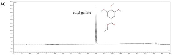 At a concentration of 10 mg/mL, the sample was produced in 50% methanol. In methanol, serial dilutions (2.5–1000 µg/mL) of the standard chemical (ethyl gallate) were produced. HPLC was conducted on a Dionex Chromelon TM chromatography data system with P580 and UVD100 detectors (Thermo Fisher Scientific Inc., Waltham, MA, USA). Chromatographic separation was conducted on an Inno C-18 column (5 µm, 4.6 × 250 nm; Young Jin). The mobile phase was made up of (A) water and (B) acetonitrile, both of which contained 0.1% formic acid, and the gradient was as follows: 95% A/5% B at 0 min; 95% A/5% B at 3 min; 85% A/15% B at 8 min; 78% A/22% B at 20 min; 76% A/24% B at 24 min; 60% A/40% B at 28 min; 5% A/95% B at 31 min; 5% A/95% B at 35 min; 95% A/5% B at 35.1 min; and 95% A/5% B at 38 min. The temperature of the column was 25 °C, the flow rate was 1.0 mL/min, and the injected volume was 10 µL.