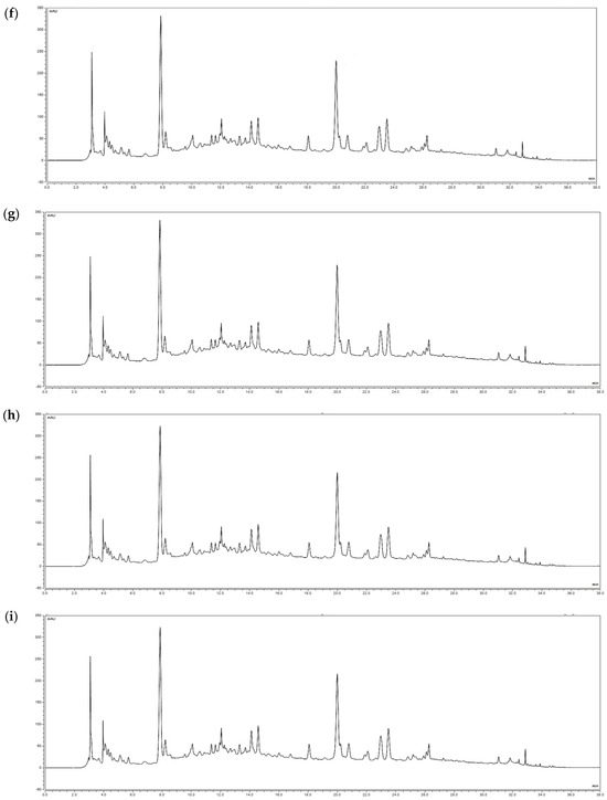 HPLC chromatograms of R. davurica buds and leaves collected in May and September with different planting intervals. (a) Ethyl gallate standard; (b) 120 × 50 cm in May (buds); (c) 120 × 100 cm in May (buds); (d) 120 × 50 cm in September (buds); (e) 120 × 100 cm in September (buds); (f) 120 × 50 cm in May (leaves); (g) 120 × 100 cm in May (leaves); (h) 120 × 50 cm in September (leaves); (i) 120 × 100 cm in September (leaves).