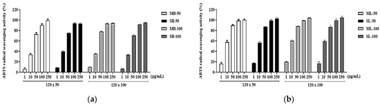 Inhibitory effects of ABTS radicals of R. davurica buds (a) and leaves (b) according to planting interval and collecting time. MB, May bud; SB, September bud; ML, May leaf; SL, September leaf. MB/ML/SB/SL-50 and MB/ML/SB/SL-100 refer to planting interval. All data are shown as the mean ± SD.