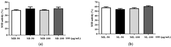 SOD activity was measured using EZ-SOD assay kits (DoGenBio, Seoul, Republic of Korea). The superoxide radicals generated by xanthine oxidase (XOD) react with water-soluble tetrazolium salt (WST) in the reaction mixture to form WST–formazan. Consequently, in the presence of high SOD activity, the oxygen radicals produced by XOD are scavenged by SOD, resulting in a relative reduction in formazan formation. The formed formazan was then measured for absorbance at 450 nm using the FilterMax F5 microplate reader (Molecular Devices, San Francisco, CA, USA).